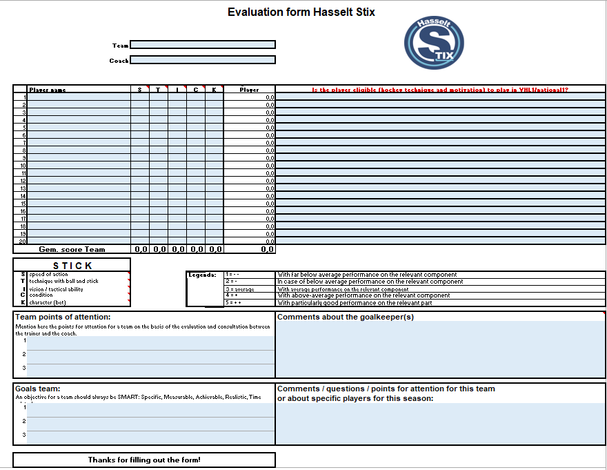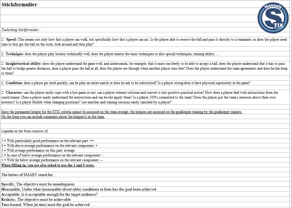 De teamsamenstellingen gebeuren door het Sportief Comité, waarbij het comité feedback krijgt over de speelsters en spelers, van de coaches en trainers volgens de leerplannen van Stix. De evaluatie gebeurt aan de hand van het STICK formulier (zie formulier hieronder) en focust op snelheid, techniek, inzicht en tactiek, fysieke paraatheid en inzet.